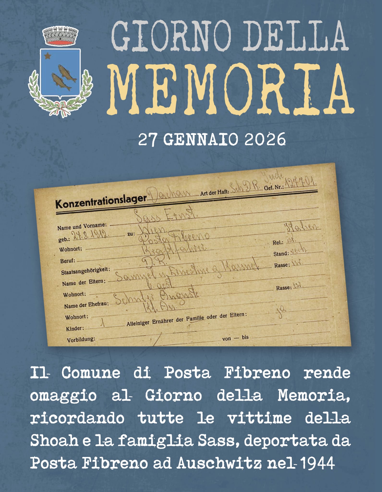 IL COMUNE DI POSTA FIBRENO RENDE OMAGGIO AL GIORNO DELLA MEMORIA, RICORDANDO TUTTE LE VITTIME DELLA SHOAH E LA FAMIGLIA SASS, DEPORTATA DA POSTA FIBRENO AD AUSCHWITZ NEL 1944.