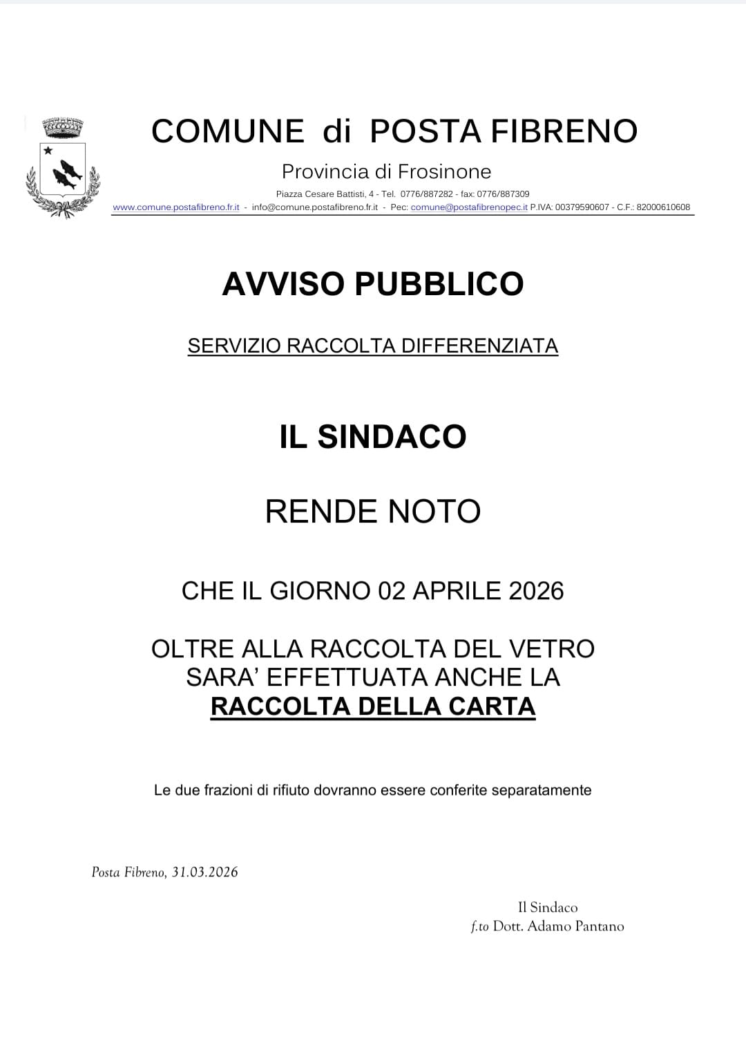 IL GIORNO 02 APRILE 2026 OLTRE LA RACCOLTA DEL VETRO SARA' EFFETTUATA ANCHE LA RACCOLTA DELLA CARTA.
